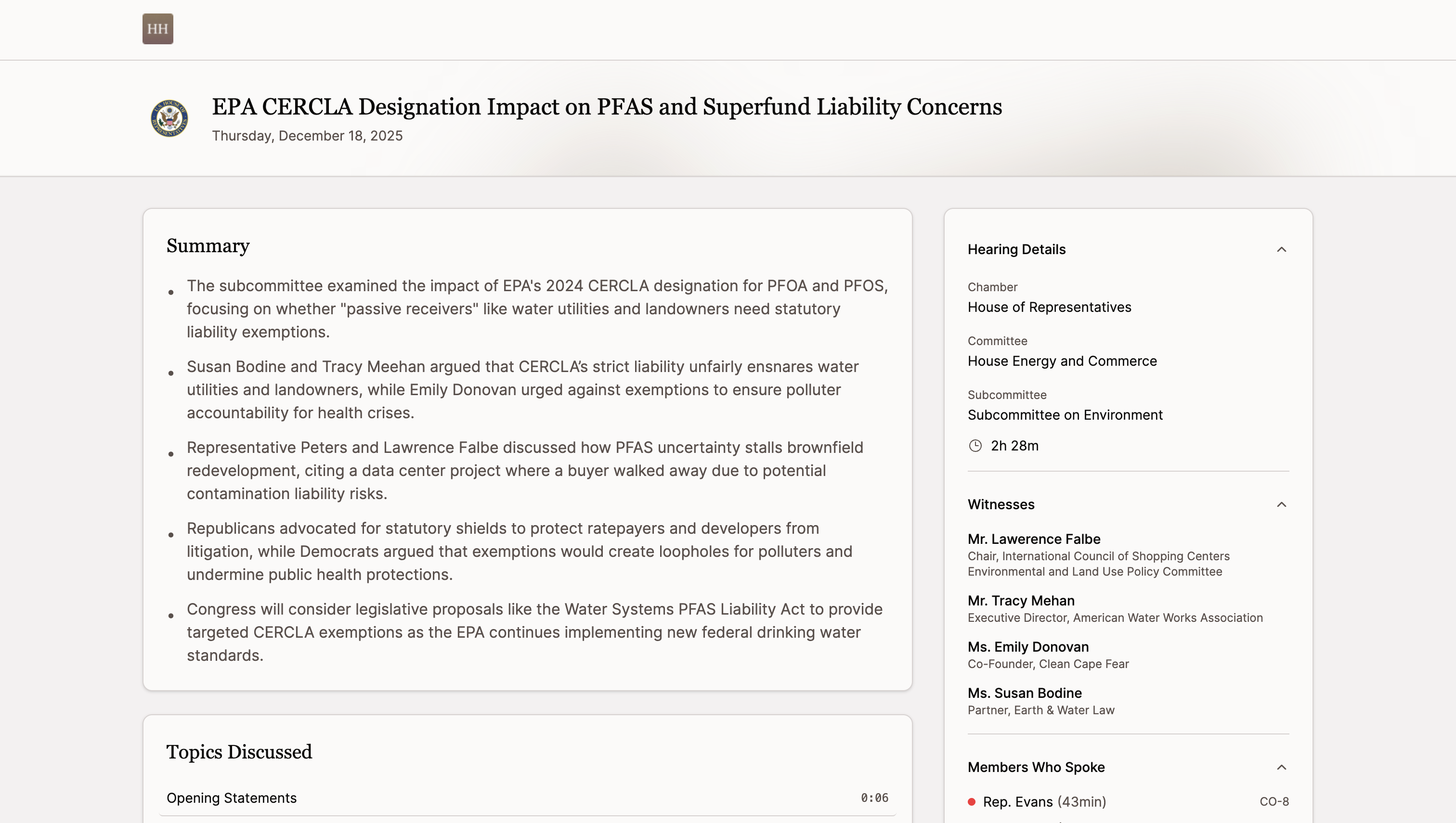 Free congressional hearing transcripts delivered to your inbox. Real-time alerts and personalized summaries for teams that need to stay ahead.