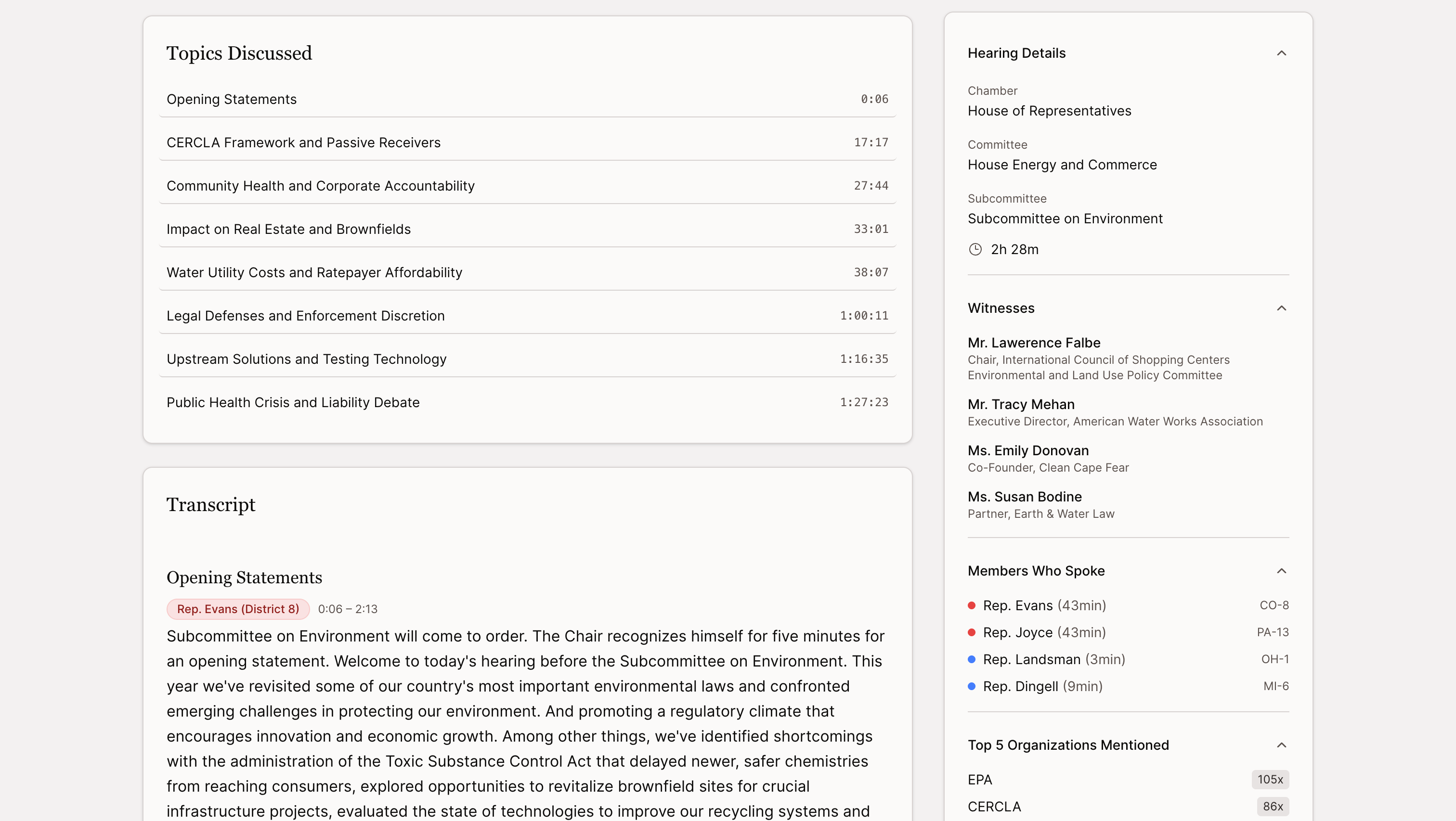 I watched government affairs teams pay thousands for transcripts of congressional hearings—or have staff spend hours transcribing just to find the 30 seconds that mattered to them. That felt broken. Hearing transcripts should be widely available, and teams should have modern tools to understand and act on them easily.